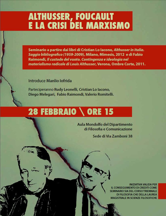 Althusser, Foucaut e la crisi del marxismo Seminario a partire dai libri di Cristian Lo Iacono, Althusser in Italia, Saggio bibliografico (1959-2009), Milano, Mimesis 2012 e di Fabio Raimondi, Il custode del vuoto. Contingenza e ideologia nel materialismo radicale di Louis Althusser, Verona Ombre Corte, 2011 Introduce Manlio Iofrida. Partecipano Rudy Leonelli, Cristian Lo Iacono, Diego Melegari, Fabio Raimondi, Valerio Romitelli 28 febbraio ore 15 |